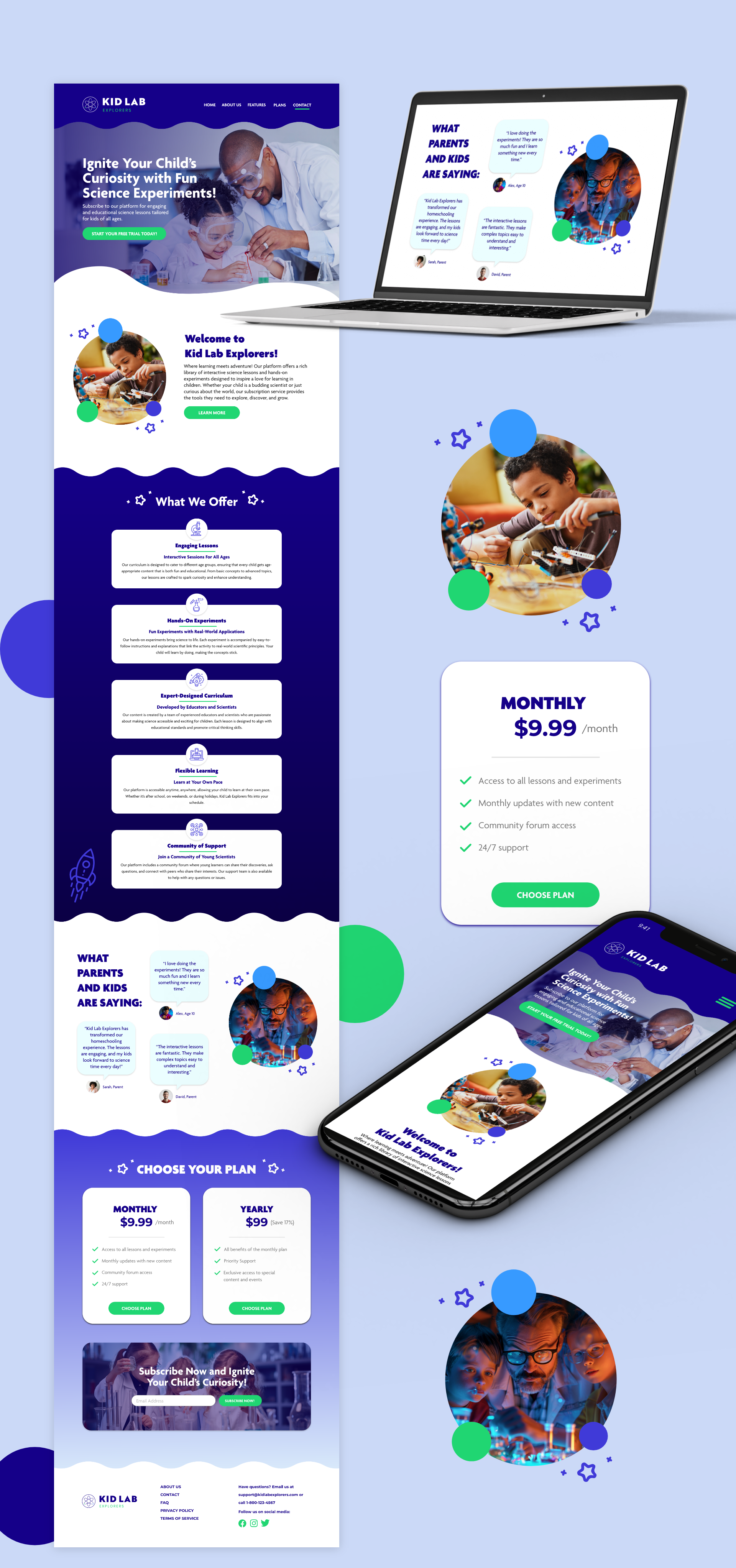 Landing Page concept design for Kid Lab Explorers, A company that offers a subscription based platform that provides science lessons and experiments for children of all ages. The goal for this landing page was to create an engaging and informative landing page that attracts parents and guardians looking for educational resources for their children. Through my design I created a visually appealing and user friendly web page that navigates consumers through what Kid Lab Explorers' mission as a company is, what they offer, and what the benefits of subscribing to the platforms are and a clear call to action.